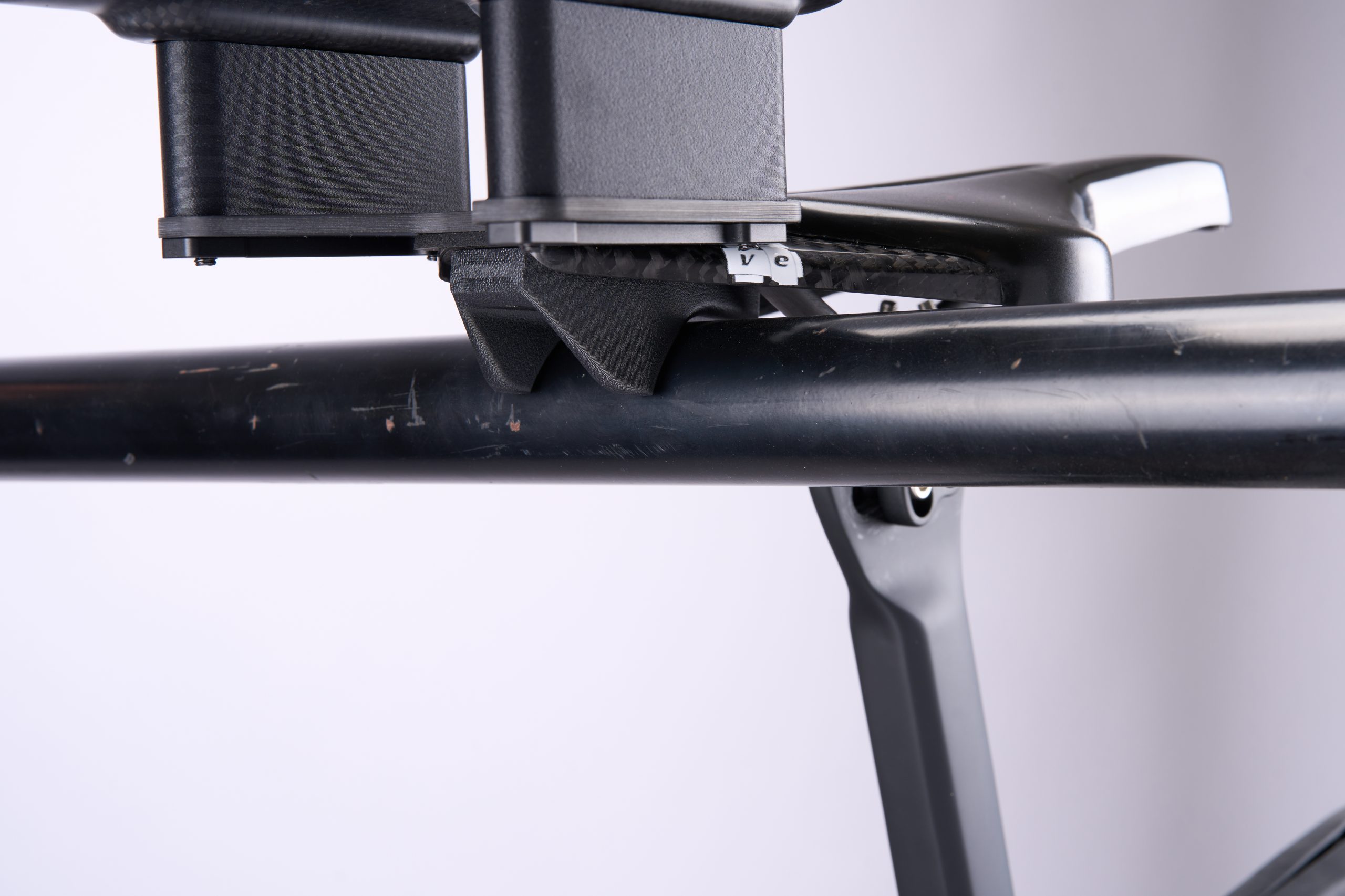The bracket under the saddle used to secure the plate mounting screws acts as a hook for the transition rack. This solves the typical issue of not being able to slide the bike under the rack when bottles are mounted above the saddle (not enough clearance under the rack). Tilting the bike to get through is not possible in tight transitions. This solves this issue!